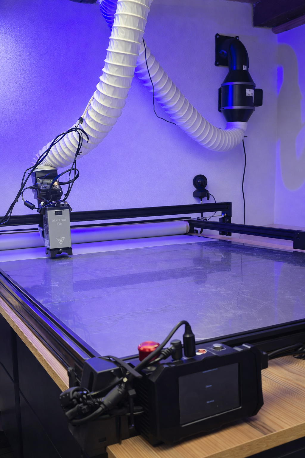 In the basement dwells our massive homegrown laser cutter. With a working area of 1.1 × 1.6 meters, it delivers uncompromising, rapid pattern manufacturing.